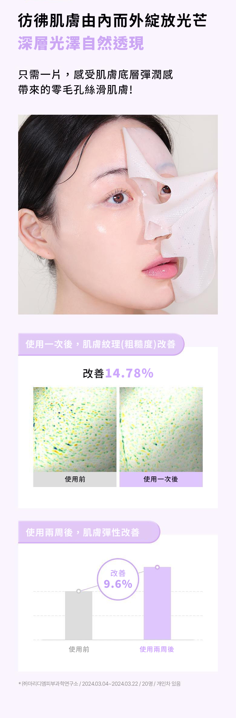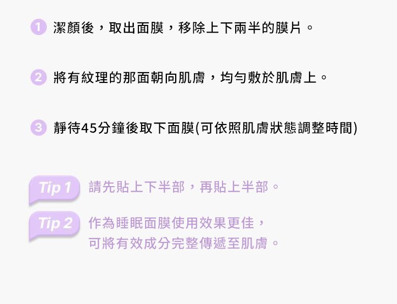 使用方法: 1.取出面膜後,移除上下兩半的膜片。2.將有紋理的那面朝向肌膚,均勻敷於肌膚上。3.靜待45分鐘後取下面膜(可依照肌膚狀態調整時間)