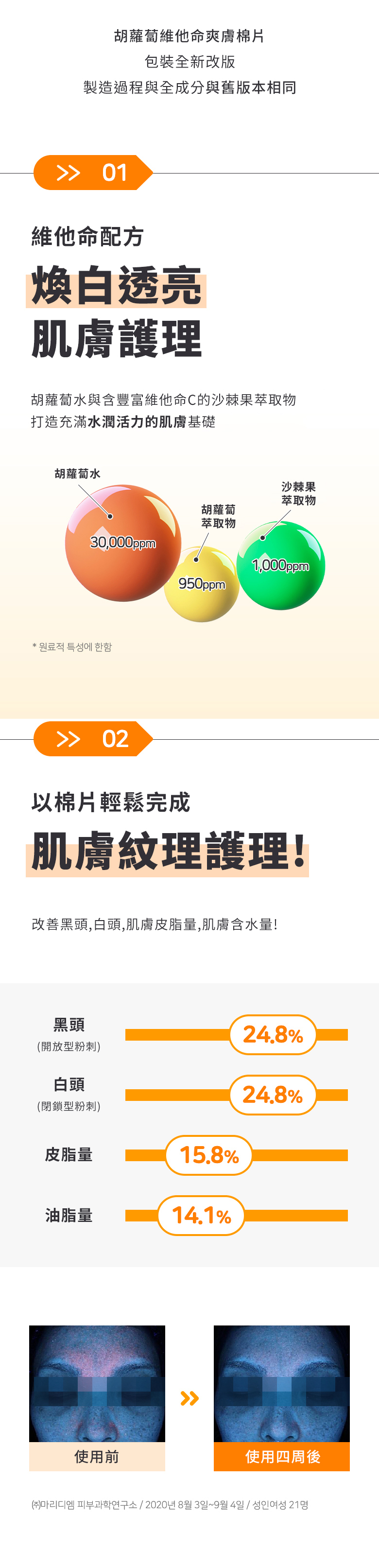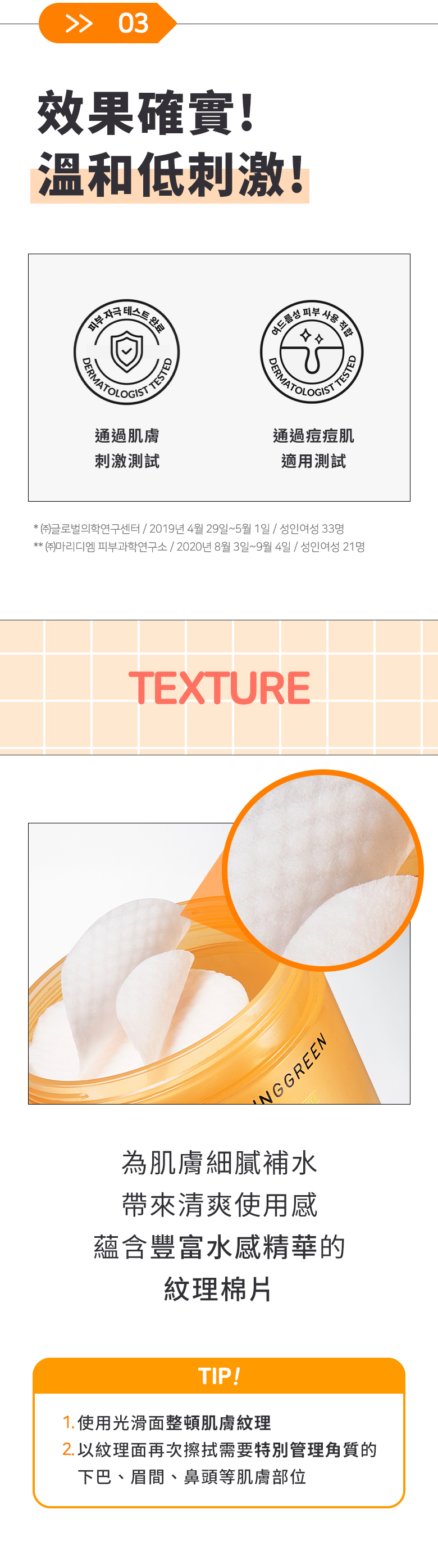 使用方法:早晚潔顏後,取 1片爽膚棉順著皮膚紋理輕輕擦拭(眼周及唇周除外),使用後將剩餘精華輕輕拍打幫助吸收。