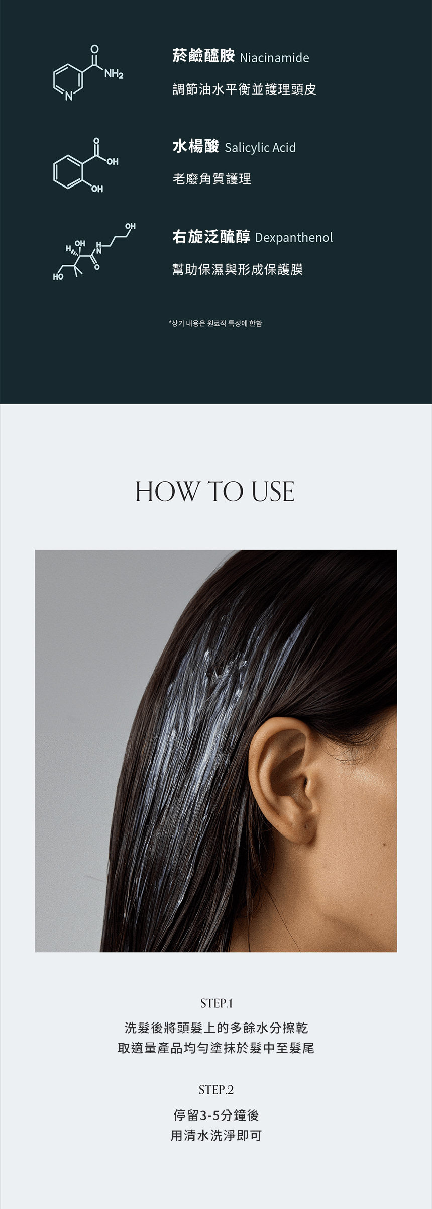 洗髮後將頭髮上的多餘水分擦乾,取適量產品均勻塗抹於髮中至髮尾。停留3-5分鐘後,用清水洗淨即可。